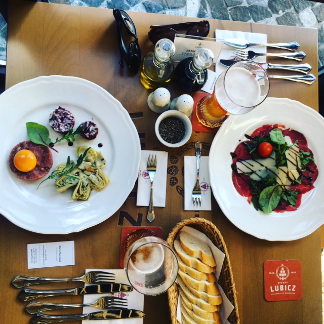 Tatar wołowy z suszonymi pomidorami i pieczonymi karczochami (37 zł) był znakomity. Świeży, idealnie posiekany, lekki, wakacyjny. Carpaccio z polędwicy wołowej z zielonym pieprzem, czosnkiem, ziołami, parmezanem, rukolą i nutą oliwy truflowej (39 zł), rozpływało się w ustach dzięki swojej delikatności a bogata ilość składników towarzyszących nadawała mu fajny smak.