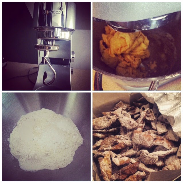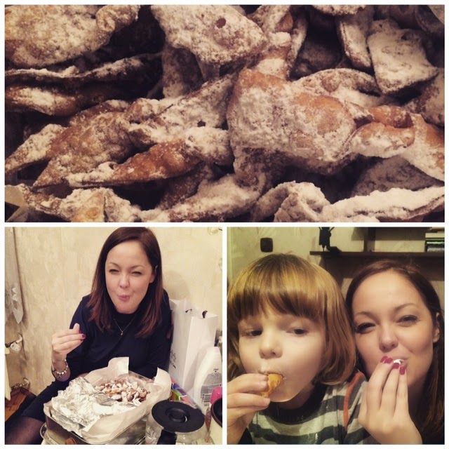 Ja i Kostek - mój chrześniak - jesteśmy zdecydowanie największymi łasuchami chrustu. Nie wiem czemu tak jest, że faworki smakują najlepiej zimową porą - jakoś w lecie zawsze o nich zapominam. Pierwsza blacha pojawia się na Dzień Babci. Wiem, trochę pokręcony zwyczaj, że w dniu Babciu wszyscy jej wnuczkowie zwalają się na wyżerkę - zamiast zabrać Babcię na jakąś przyzwoitą kolację. Tak się utarło od lat i co roku Babcia gości u siebie nie tylko wnuki ale i prawnuki.