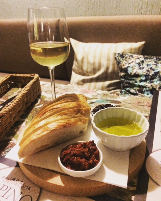 Duże karty menu przypominają mi te z Zakładki ale mimo, po prostu tam pasują. Może nie są za wygodne ale ten motyw "gazety" jakoś strasznie pasuje mi do francuskich klimatów. Nie wiem, może oglądam za dużo filmów. Tak czy siak oprócz regularnego menu, można znaleźć wkładkę odnośnie pojawiających się tu owoców morza (pięknie nazwanym weekendem z Frutti do Mare). I teraz wyobraźcie sobie mój konflikt tragiczny. Co zjeść? Mięso, czy owoce morza. Bo tak: w menu regularnym widzę carpaccio z wędzonej gęsi a we wkładce grillowane ośmiorniczki. No jak żyć?! Ja wiem, że jestem kobietą i codziennie życia stawia mnie w konflikcie tragicznym (zwłaszcza na tle mojej szafy i tego, że nie mam się w co ubrać) ale to nie na moje nerwy. Co więc robię? To, co zawsze takich sytuacjach - sięgam po wino! A nawet dwa! Delikatne, białe, domowe. Do wina skomponowany zestaw (10 zł) z dwóch past (są trzy): z suszonych pomidorów oraz grzybowo-truflowa. Do tego oliwa, bagietka.