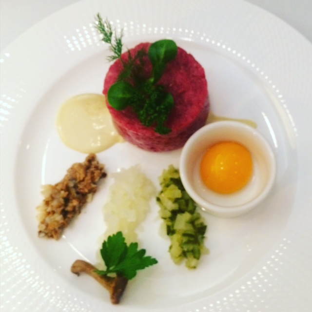 Był to między innymi tatar wołowy - klasyczny, bez udziwnień, prosto, schludnie podany oraz carpaccio z polędwicy wołowej w aromacie trufli. W ogóle wołowina w wydaniu tego sztabu kuchennego jest naprawdę nieźle przyrządzona. Na wyróżnienie zasługują policzki wołowe w sosie z czerwonego wina - niezwykle delikatne, aromatyczne i polędwica wołowa w sosie z zielonego pieprzu. I tu się zatrzymam ponieważ metoda gotowania jej w sous vide nadała mięsu naprawdę niezwykłą miękkość i soczystość. Ostry sos znakomicie z tym współgrał. Nic dziwnego, że po takiej "wołowej" uczcie zachciało mi się jeszcze lodów waniliowych podanych z sosem z regionalnych malin lub raczej powiedziałabym, że zupy malinowej z lodami. Jak zwał tak zwał ale było to szaleństwo i było pyszne.