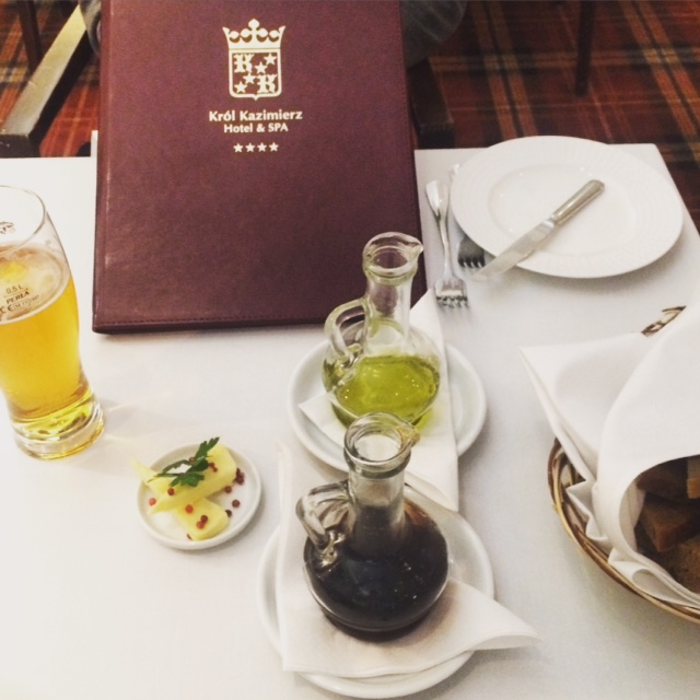 Nie omieszkałam również spróbować regionalnych piw, dość ciekawych, pełnych w smaku. I tu dopada mnie nostalgia ponieważ żałuję bardzo, że nasze regionalne piwa, które mam okazję pić w każdym z odwiedzonych miejsc, nie są powszechnie dostępne. Szkoda, wielka szkoda, bo są one wyjątkowe w smaku. Podobnie jak dania, które zatrzęsły moim podniebieniem i które mogę zabrać z podróży do mojej kuchni. Takim daniem jest niewątpliwie panierowany w orzechach ser kozi z gałką sorbetu owocowego. Takie proste, tyle odsłon tego dania w różnych miejscach ale to właśnie Hotel Król Kazimierz podał je w ten a nie inny sposób i trudno będzie mi o tym zapomnieć.