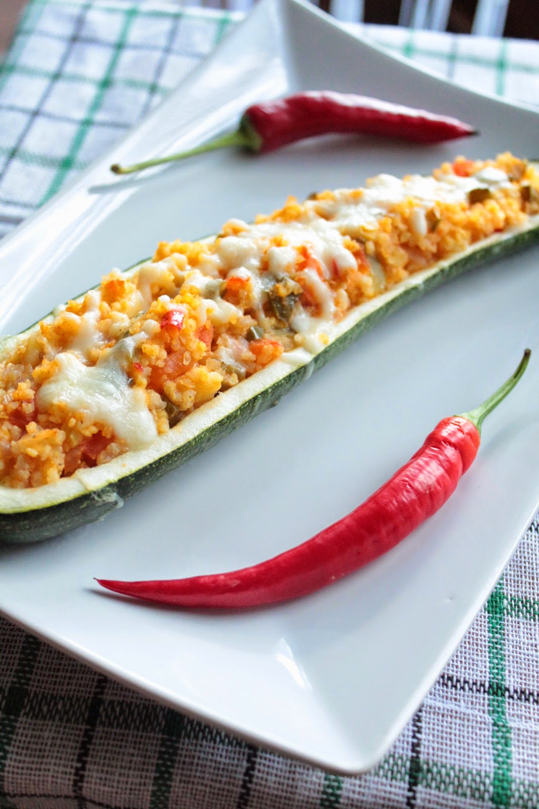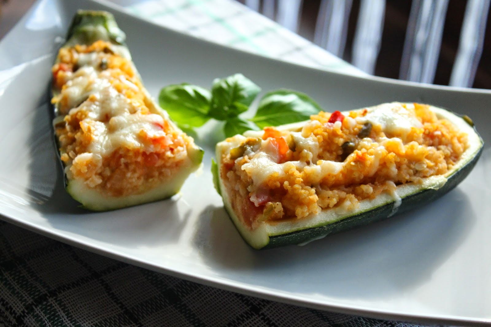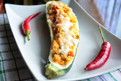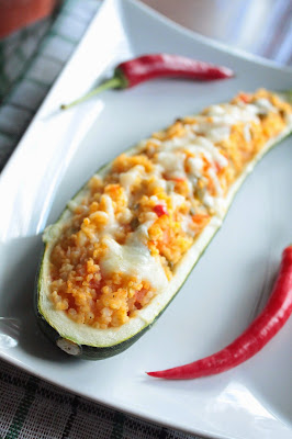 Czosnek i cebulkę pokroić w drobną kostkę i podsmażyć na oliwie. Dodać pokrojone w kostkę paprykę, pomidory (wcześniej obrane ze skórki) i środek z cukinii. Przyprawić i dusić pod przykryciem, aż wszystkie warzywa będą miękkie. Wymieszać warzywa z kaszą jaglaną i tak przygotowanym farszem wypełnić cukinie. Posypać serem mozzarella (ja posypałam dopiero po ok. 20 min pieczenia). Piec w piekarniku rozgrzanym do temp. 180 st. przez 30 min.