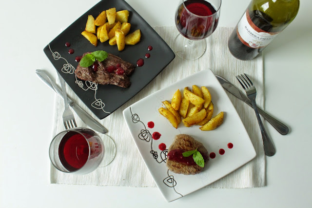 Mięso: Piekarnik nagrzewamy do temp. 180 st. Patelnię grillową smarujemy delikatnie olejem lub masłem klarowanym. Stek solimy z jednej strony i kładziemy nią na rozgrzaną patelnię. Smażymy przez 1,5-4 min w zależności od stopnia wysmażenia jaki chcemy osiągnąć. Solimy drugą stronę i obracamy. Następnie wkładamy do piekarnika na 3-4 minuty.