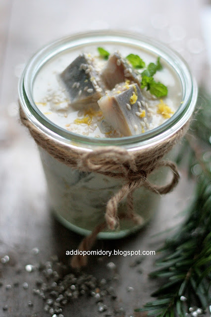 5. W słoiczku na dnie układamy kilka kawałków śledzia, posypujemy go skórką cytrynową i cebula, zalewamy częścią śmietanowej masy. Układamy w ten sposób kolejne warstwy.