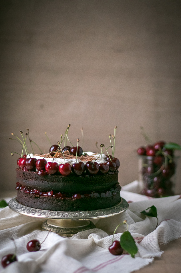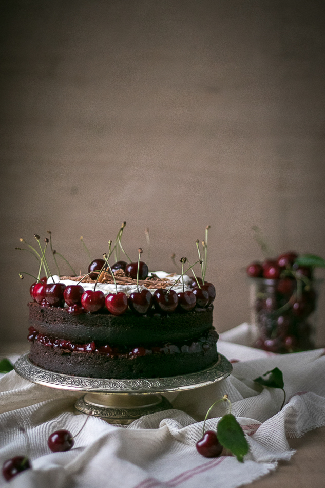 9. Na środku rozsmarowujemy krem, na brzegu układamy czereśnie. Krem posypujemy wiórkami czekolady.
