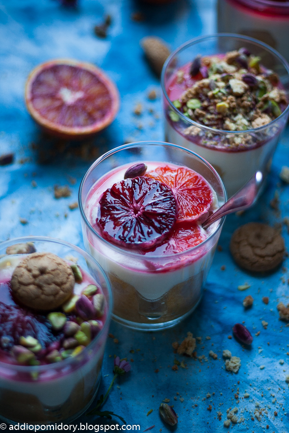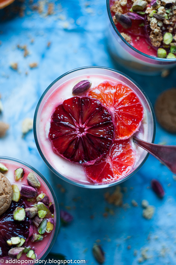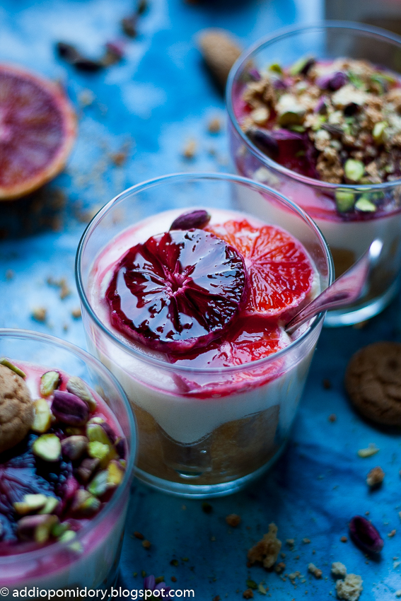 8. Przed podaniem dekorujemy nasze tiramisu pomarańczami, pokruszonymi ciasteczkami amaretti, pistacjami i sokiem z pomarańczy, który się wytworzył podczas leżakowania owoców.