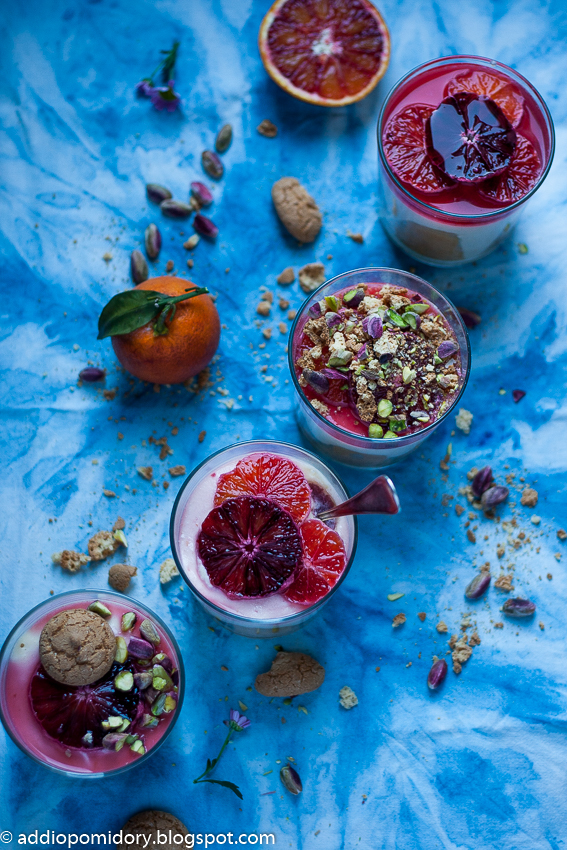 8. Przed podaniem dekorujemy nasze tiramisu pomarańczami, pokruszonymi ciasteczkami amaretti, pistacjami i sokiem z pomarańczy, który się wytworzył podczas leżakowania owoców.