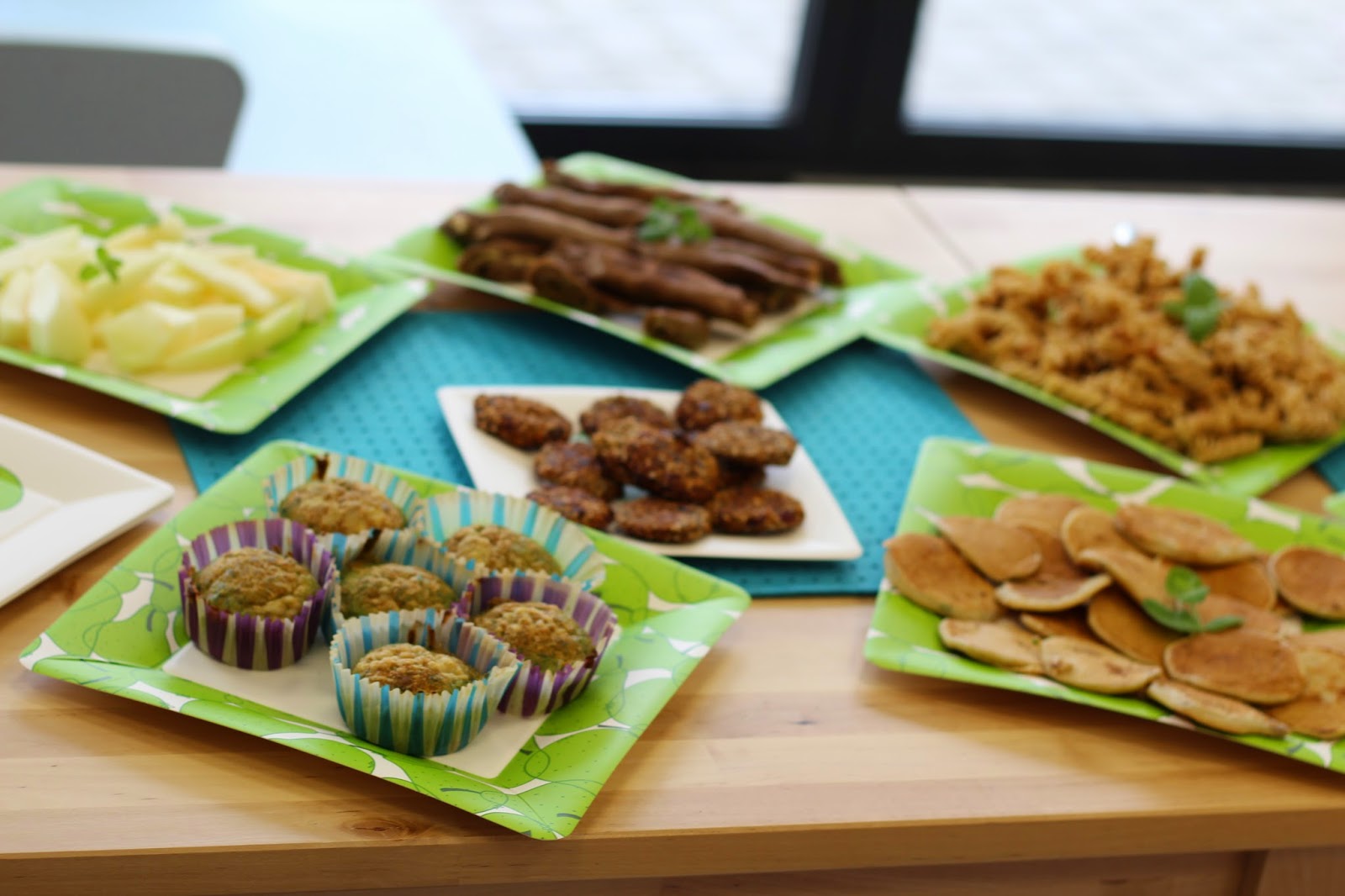 Na stole gościły: muffinki szpinakowe, makaron z pesto z soczewicy, amarantusowe placki z marchewką, ciastka owsiane, naleśniki karobowe, placki z kaszy manny, melon. Wszystkie przepisy na blogu:)