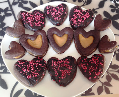 Ciasteczka czekoladowe w kształcie serca idealne na jutrzejsze Walentynki :-)Są bardzo proste w przygotowaniu- wszystkie składniki razem uciera się mikserem. Można je wykonać w kilku wersjach: pojedyncze z polewą lub podwójne przekładane ulubioną masą. Ja zrobiłam w trzech wersjach - pojedyncze z polewą posypane maczkiem truskawkowym, podwójne małe serduszka przekładane kajmakiem, podwójne ciasteczka z dziurką z mniejszego serduszka również przekładane kajmakiem. Są pyszne- mocno czekoladowe! Zniknęły w mgnieniu oka ;-)