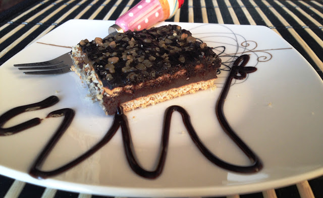Gorzką czekoladę rozpuszczamy w kąpieli wodnej ( można do czekolady dodać łyżkę masła), a następnie rozsmarowujemy ją na wierzchu herbatników. Posypujemy posiekanymi orzechami. Ciasto jest gotowe do spożycia gdy jest zimne i zastygnie.