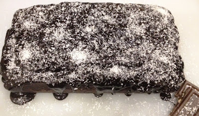 Przygotowujemy polewę: Czekoladę rozpuszczamy w kąpieli wodnej. Podczas rozpuszczania czekolady możemy dodać 2 łyżki gorącej wody, wtedy polewa jest mniej gęsta. Gotową polewę wylewamy na wierzch ostygniętego ciasta i posypujemy wiórkami kokosowymi.