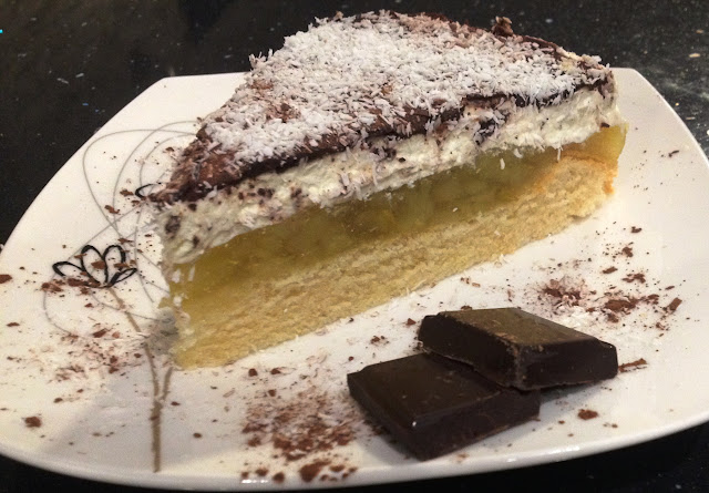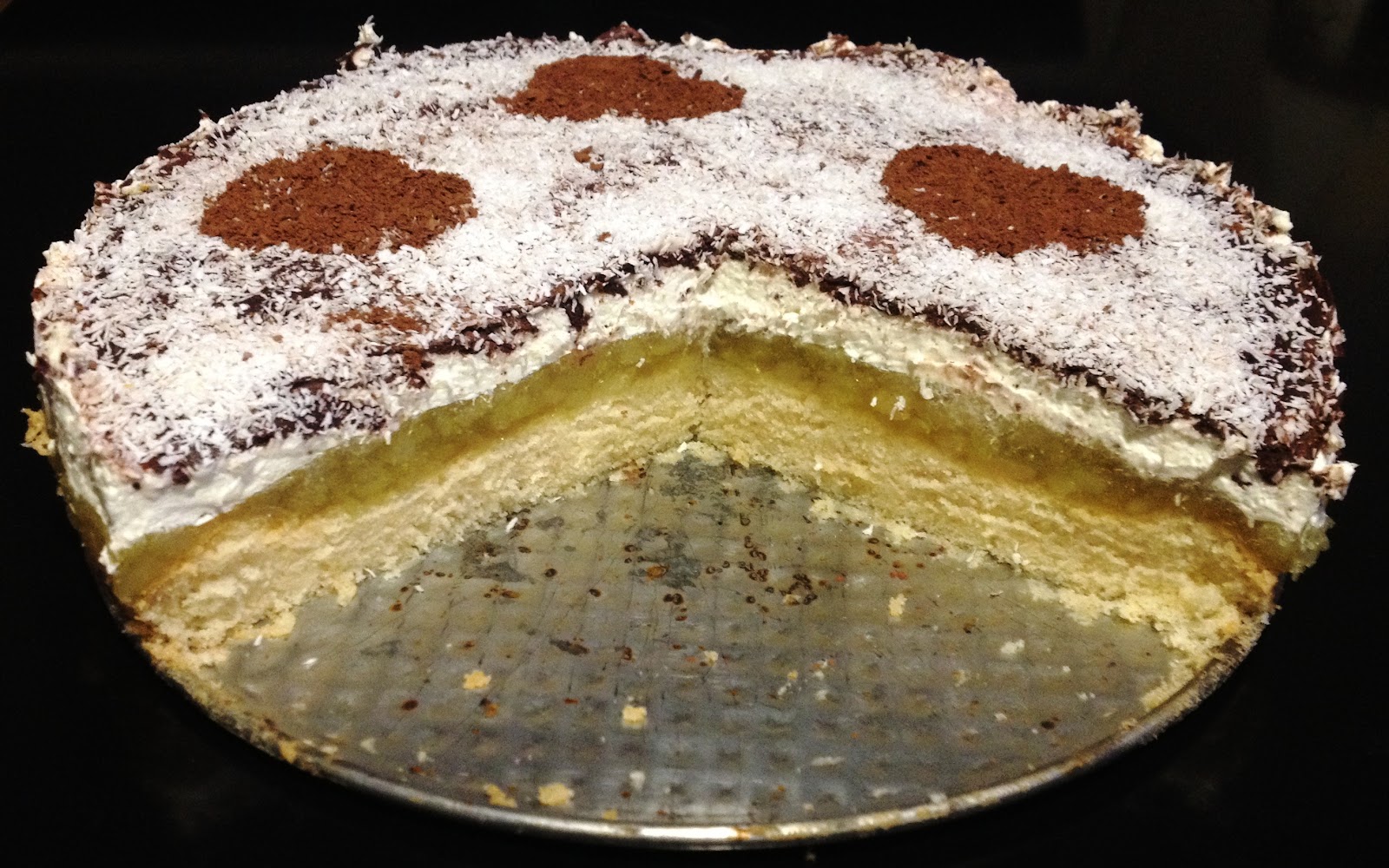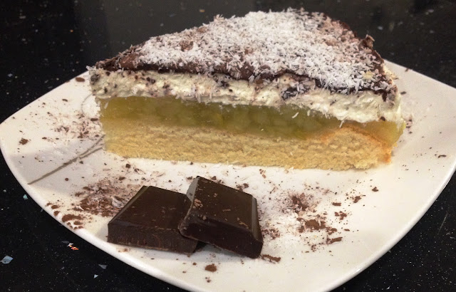Do miski wlewamy śmietanę, dodajemy cukier puder i miksujemy aż masa zesztywnieje. Gotową masę śmietanową wykładamy na masę gruszkową i ponownie wkładamy do lodówki. Czekoladę topimy w kąpieli wodnej i rozsmarowujemy na sztywnej śmietanie i posypujemy wiórkami kokosowymi. Przechowujemy w lodówce.