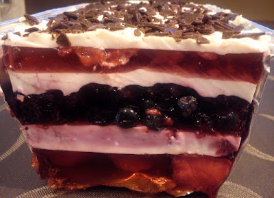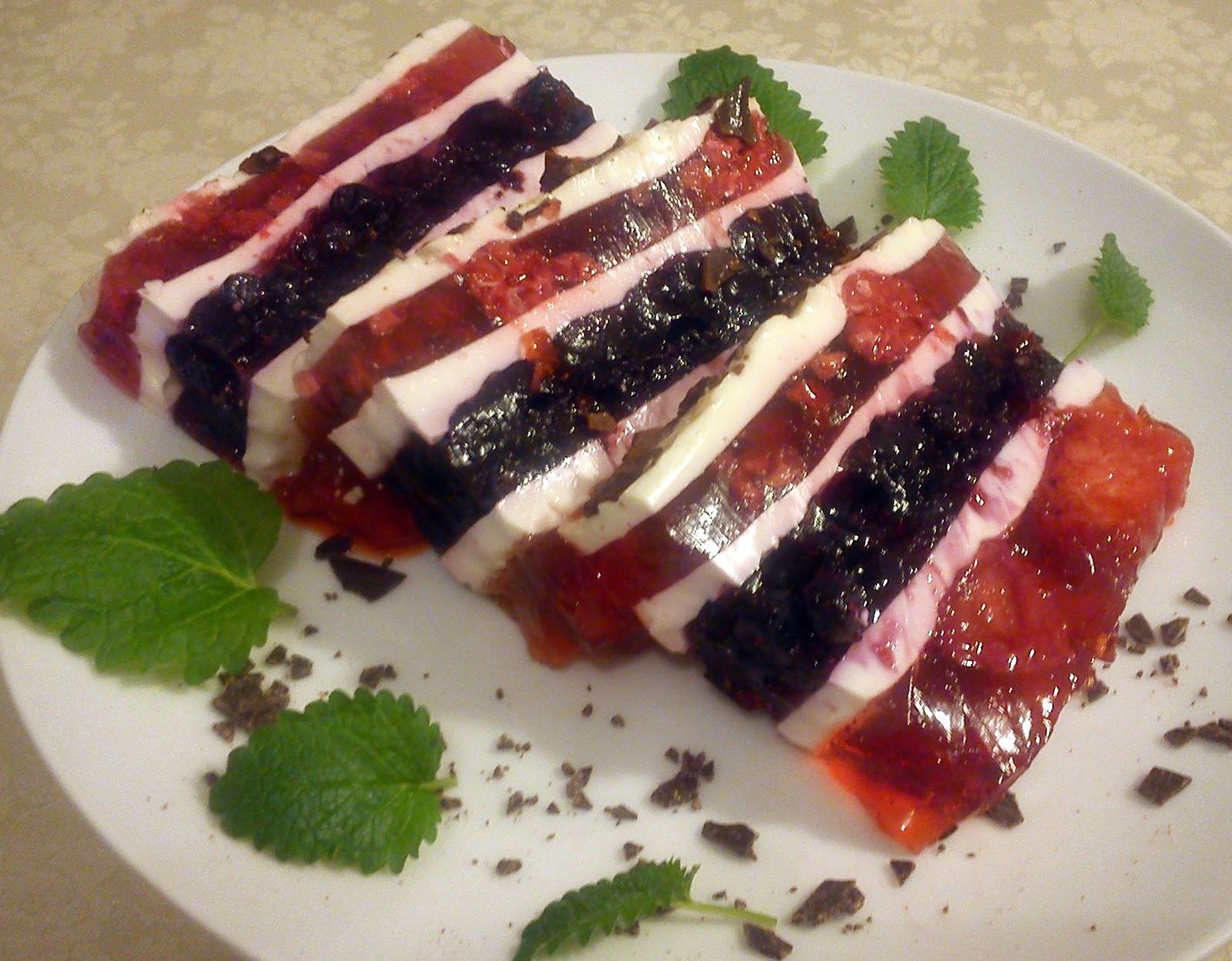 Moje ptasie mleczko to taki owocowy blok galaretkowy. Jest to bardzo lekki deser, nawet dla osób na diecie ;) Wykonanie jest bardzo proste, choć trochę pracochłonne, ale nie trzeba mieć piekarnika ;) Poszczególne warstwy ptasiego mleczka mogą mieć taki smak, na jaki tylko mamy ochotę. Ja wykorzystałam galaretki : truskawkową, owoce leśne i malinową, do których wrzuciłam mrożone owoce tj. truskawki, jagody i maliny. Galaretki owocowe oddzieliłam od siebie białą pianką tj. galaretką śmietanowo-mleczną. A efekt był smakowity!