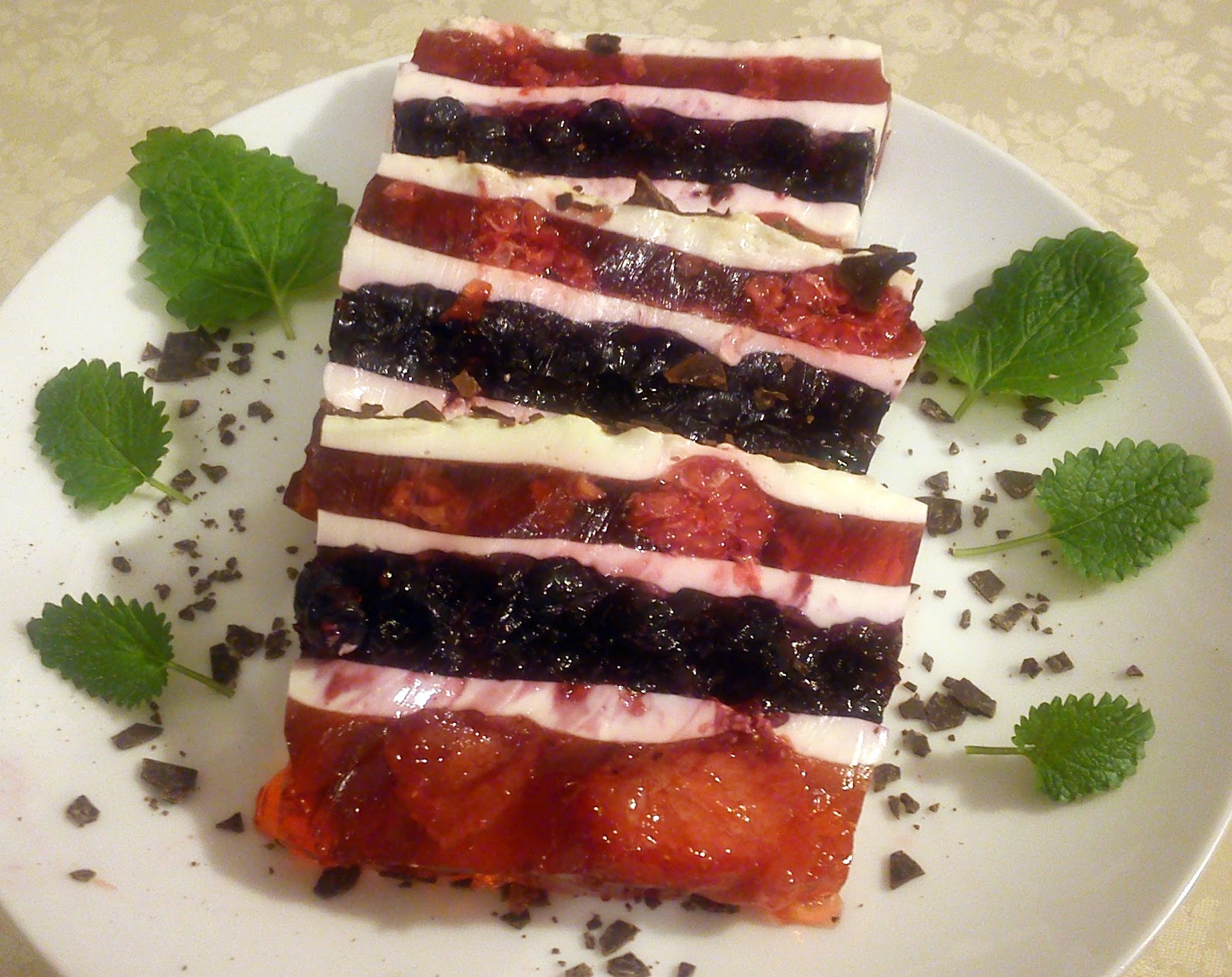 Moje ptasie mleczko to taki owocowy blok galaretkowy. Jest to bardzo lekki deser, nawet dla osób na diecie ;) Wykonanie jest bardzo proste, choć trochę pracochłonne, ale nie trzeba mieć piekarnika ;) Poszczególne warstwy ptasiego mleczka mogą mieć taki smak, na jaki tylko mamy ochotę. Ja wykorzystałam galaretki : truskawkową, owoce leśne i malinową, do których wrzuciłam mrożone owoce tj. truskawki, jagody i maliny. Galaretki owocowe oddzieliłam od siebie białą pianką tj. galaretką śmietanowo-mleczną. A efekt był smakowity!