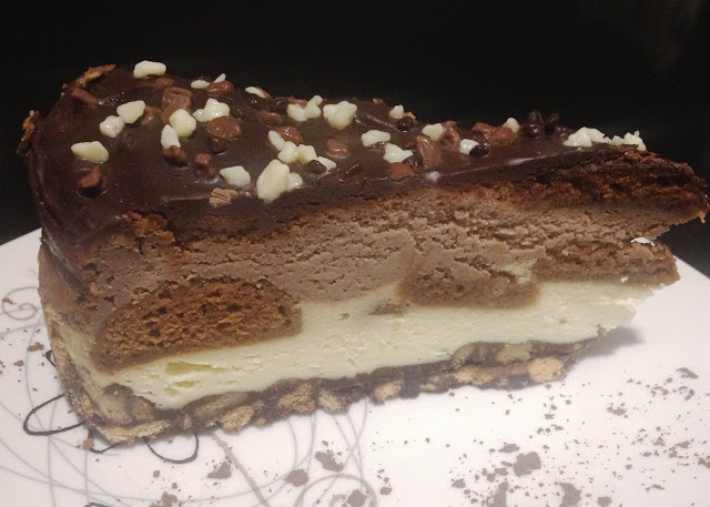 Zaczął się grudzień, miesiąc świąteczny, wszędzie już w sklepach widać choinki, ozdoby, mikołaje... więc i mnie wzięło na ciasto w klimacie świąt. Postanowiłam upiec sernik, bo to kultowe ciasto każdych świąt u mnie w domu, zawsze piekła go babcia Marianna :) Ale żeby nie był to nudny sernik to trochę pokombinowałam..prezentuję sernik czekoladowo-waniliowy na herbatnikowym spodzie z piernikami i polewą czekoladową. Naprawdę jest pyszny!