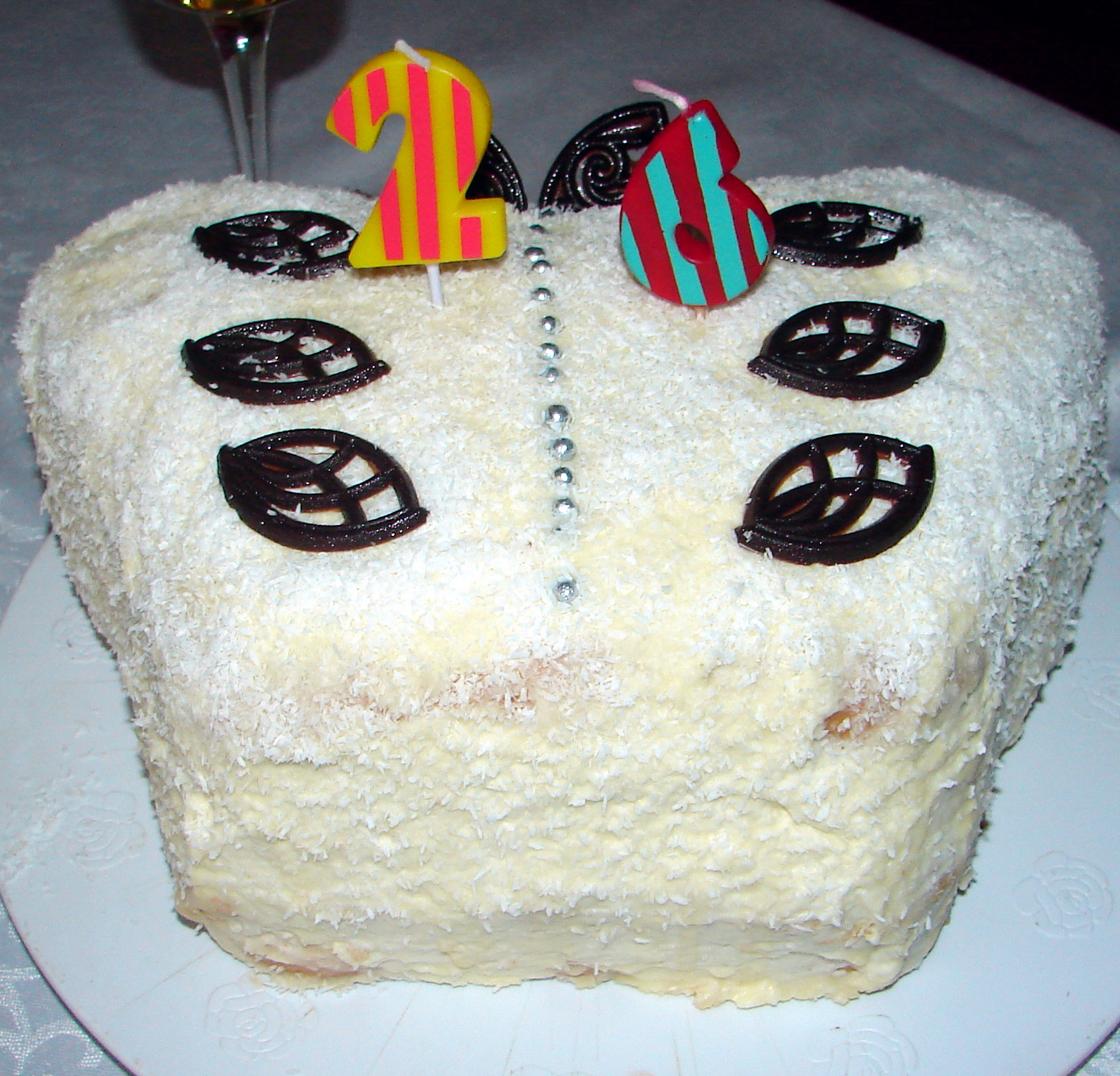 Każdy z biszkoptów przecinamy na pół. Pierwszy blat biszkoptu nasączamy ponczem i wykładamy na niego ok. 1/3 masy kokosowej, rozsmarowujemy i przykrywamy drugim blatem. Na drugi blat biszkoptu wykładamy dżem i przykrywamy trzecim. Trzeci blat nasączamy ponczem, wykładamy ok. 1/3 masy kokosowej i przykrywamy ostatnim blatem biszkoptowym. Na wierzchu i po bokach tortu rozsmarowujemy pozostałą część masy kokosowej.Białą czekoladę rozpuszczamy w kąpieli wodnej, czekamy aż lekko wystygnie ( ale żeby nie zastygła) i polewamy nią tort. Na końcu obsypujemy wiórkami kokosowymi i dekorujemy według upodobania. Tort wkładamy do lodówki.