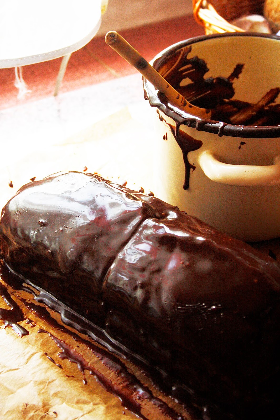 Polewa jest jeszcze prostsza w przygotowaniu ponieważ rozpuszczamy czekoladę w kąpieli wodnej dodajemy troszkę mleka, syrop klonowy i masło orzechowe. Ostudzone wypiek oblewamy wykańczając boki do samego dołu.