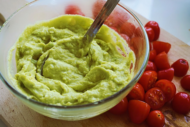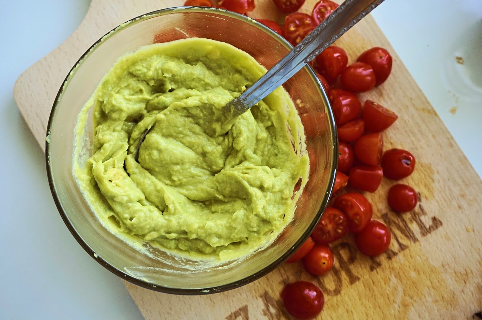 Awokado rozgniatamy widelcem dodajemy sok z cytryny, sól, pieprz, czosnek i ponownie mieszamy i rozgniatamy. W ten sposób uzyskujemy pastę i drobnymi kawałkami awokado.