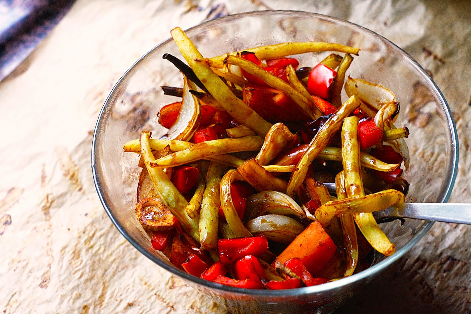 Warzywa myjemy, płuczemy, obieramy znów myjemy i kroimy w paseczki, słupki, co tylko chcemy. Piekarnik nagrzewamy do 200 stopni. Fasolkę, marchewkę i pietruszkę gotujemy w wodzie przez około 10 minut. Po tym czasie na papierze do pieczenia wykładamy zawartość garnka dodajemy paprykę, cukinię i cebulkę posypujemy dowolną ilością przypraw oraz podlewamy sosem sojowym. Lekko przemieszamy i pieczemy 20 minut. Kiedy po tym czasie podamy warzywa możemy podlać je dodatkowo sosem sojowym, który idealnie się z nimi komponuje.