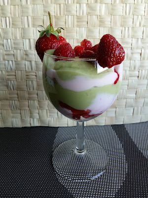 Avokado obieramy ze skórki i miąższ blendujemy z dwiema łyżeczkami miodu (nie będzie wówczas taki mdły). Oszypułkowane truskawki kroimy na pół, następnie do pucharków lub wysokich szklanek układamy naprzemiennie truskawki, jogurt truskawkowy oraz mus z avokado. Górę deseru dekorujemy kawałkami truskawek i na przykład płatkami migdałów. Przed podaniem deser najlepiej schłodzić kilka minut w lodówce.