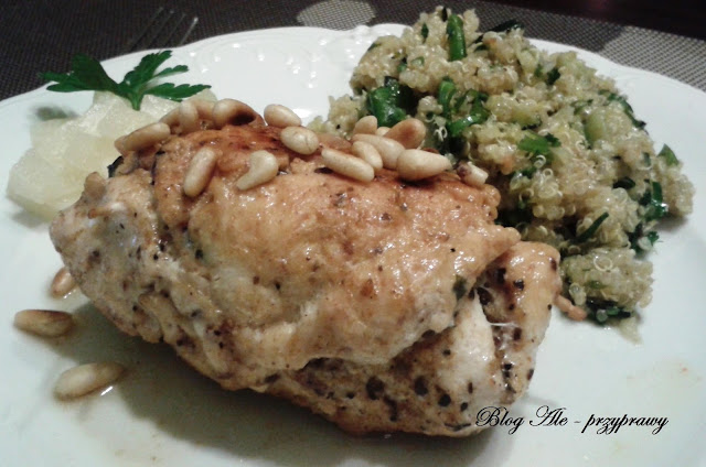Przepis w sam raz na obiad we dwoje ;) Moja propozycja - rolada z piersi kurczaka z ananasem i orzeszkami Pini i sałatką z komosy ryżowej, którą można podawać na ciepło i na zimno. Smaki świetnie się uzupełniają. Moja inwencja twórcza :)