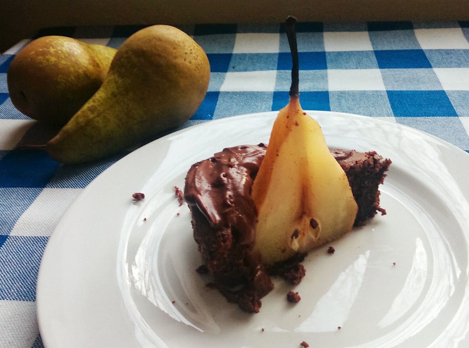 Ciasto czekoladowo-migdałowe z całymi gruszkami nie tylko prezentuje się wytwornie ale i wspaniale smakuje.