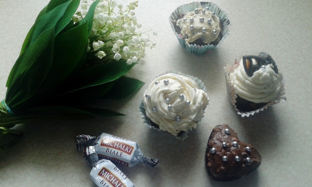 można też udekorować muffinki polewą michałkową, należy przedtem rozpuścić kilka cukierków w kąpieli wodnej i delikatnie rozsmarować na powierzchni