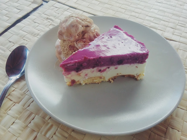 intensywnie liliowa warstwa nad śnieżnobiałym spodem. Sernik jest bardzo lekki, wykonany z serka homogenizowanego i jogurtu greckiego, co idealnie wpsasowuje go w kanon letnich deserów. Co prawda owocowa warstwa jest trochę oszukana, porzeczki wystepują w niej w postaci konfitury, jednak ja bym to uznała za plus. Nie musimy ograniczać się do świeżych, sezonowych owoców, które i tak musielibyśmy odpowiednio przygotować, posłodzić, itd. Dżemy z dużymi kawałkami owoców są tu więc niezłą opcją.
