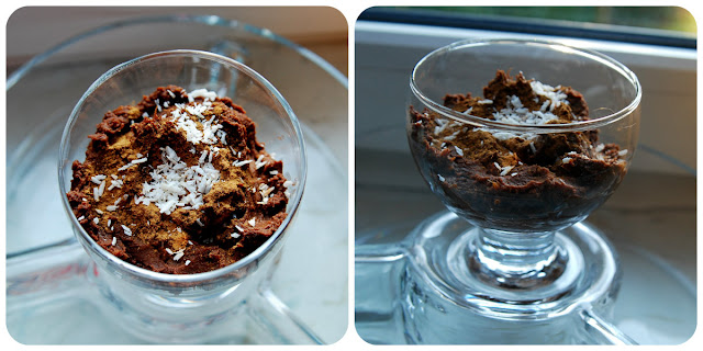 Batata obieramy i gotujemy na parze do miękkości. Przekładamy go do miseczki i rozgniatamy widelcem na papkę (lub używamy w tym celu blendera). Następnie dodajemy do niego kakao, miód i śmietankę kokosową. Wszystko dokładnie mieszamy (lub jeśli wolicie idealnie gładkie konsystencje - blendujemy). Wierzch posypałam karobem i wiórkami kokosowymi, można posłużyć się płatkami migdałów, orzechami włoskimi, drobno pokrojonymi kasztanami czy suszonymi daktylami.