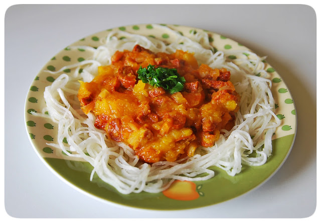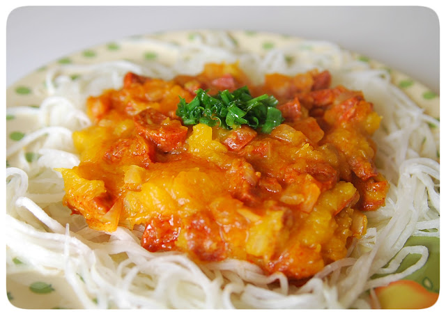 [tutaj]. Taki makaron można jeść na surowo, podsmażyć na maśle ghee z dodatkiem czosnku lub tak jak ja - udusić (ok 5 min wystarczy) w osolonej wodzie - do wody możecie dodać kurkumę lub curry, aby nadać jej żółtego koloru.