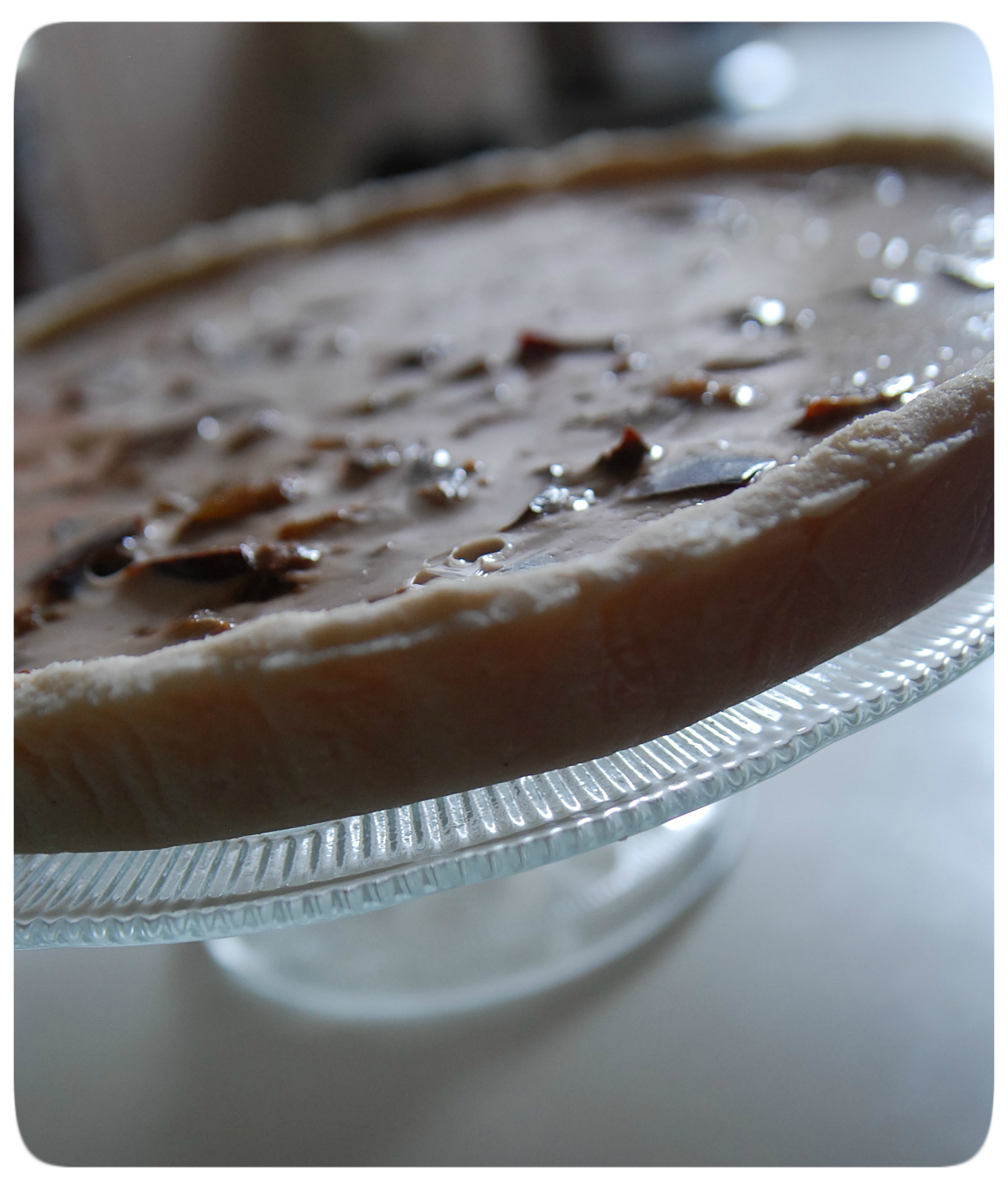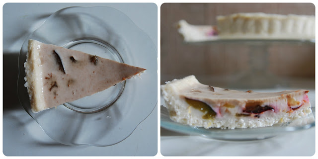 Następnie dodałam do kokosowego mleka drobno pokrojone śliwki. Wyjęłam z lodówki tężejącą tartę i wylałam na nią mój hmm ... no - "filling". Wstawiłam do lodówki na kilka godzin, aż do stężenia (można użyć zamrażarki, trwa to wtedy znacznie krócej, niestety moja zamrażarka wypełniona jest mięsem). Gotowe. Tarta stała sobie całą noc w lodówce (w zasadzie to była gotowa na sobotę wieczór, jednak światło nie sprzyjało jej fotografowaniu, więc musiała uzbroić się w cierpliwość i została spróbowana dopiero w niedzielę rano).