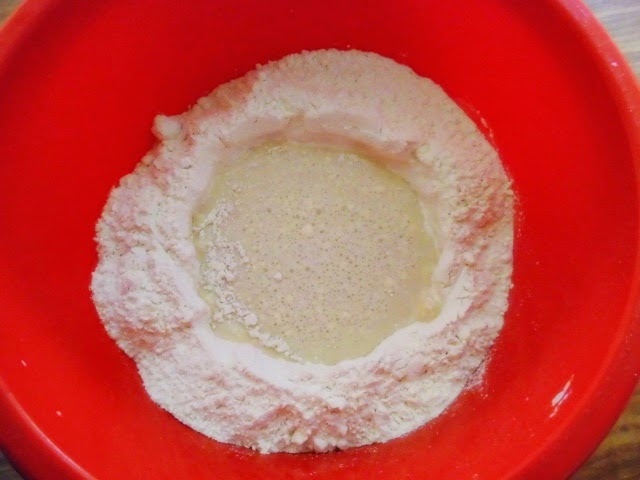 Przygotowanie: Mąkę wsypać do większej miski, zrobić dołek. Drożdże rozkruszyć do dołka, dodać 1 łyżkę cukru i 1/2 szklanki mleka, wymieszać delikatnie aby nie wmieszać mąki.