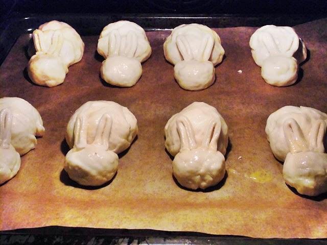Z ciasta zrobić 9 większych kulek (brzuszek) i 9 mniejszych kulek (głowa). Wyłożyć na blachę od piekarnika i połączyć brzuch z głową za pomocą roztrzepanego jajka. Kawałek ciasta cienko rozwałkować złożyć na pół i pokroić na 18 cienki pasków i tak powstały uszy. Za pomocą wykałaczki wcisnąć je delikatnie w głowę zajączka. Z reszty ciasta zrobić 9 małych kulek i przykleić za pomocą jajka z tyłu zajączka i tak powstał ogonek. Zajączki posmarować jajkiem i piec około 20 min w 180C-200C.