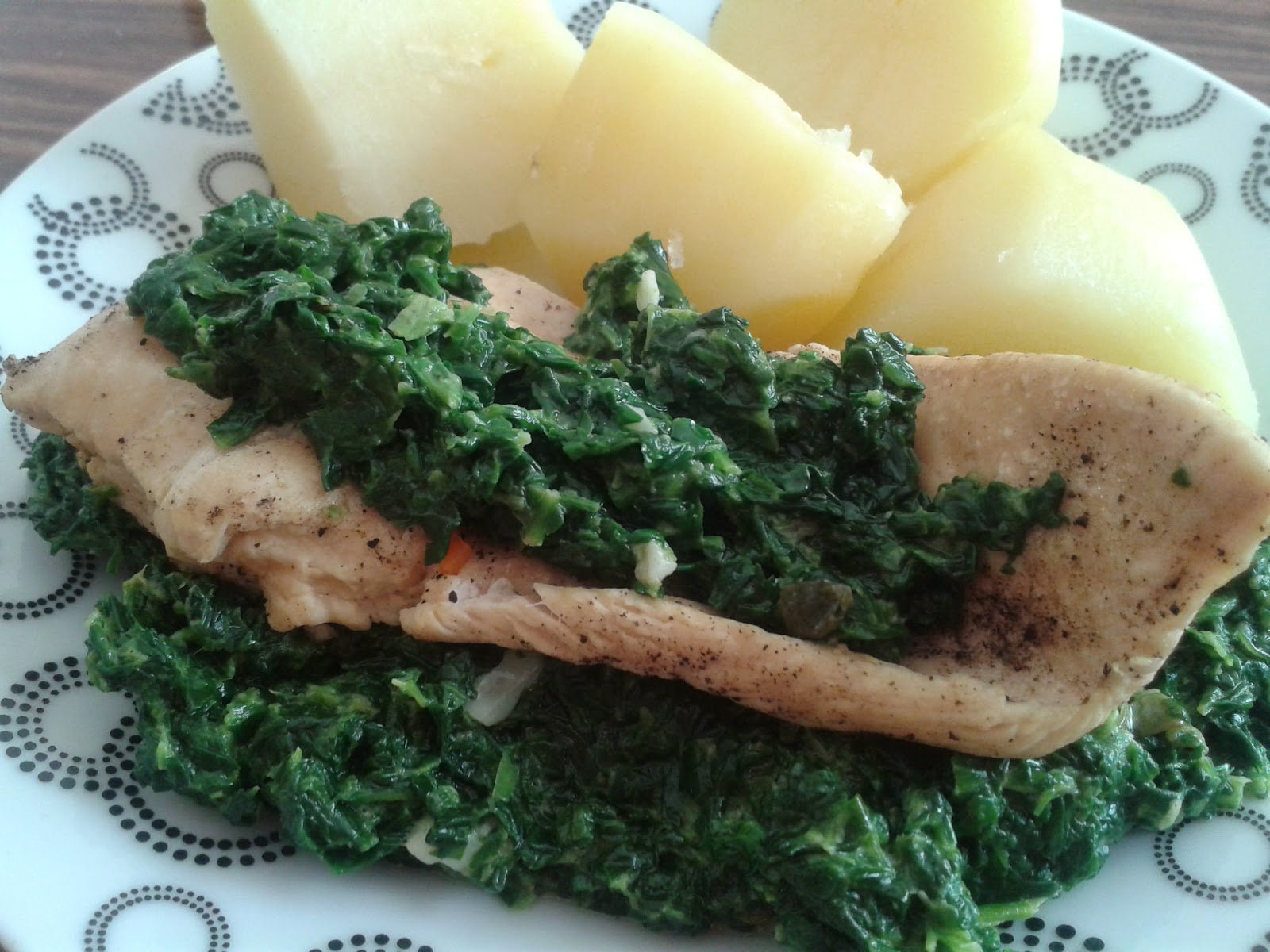 Mięso oczyścić, umyć i pokroić na kotlety. Oprószyć solą i pieprzem i zagotować do miękkości w bulionie. Na patelni rozgrzać olej i podgrzać szpinak. Dodać przeciśnięty przez praskę czosnek i przez chwilę zostawić na wolnym ogniu. Na koniec dodać serek topiony i pogrzać mieszając, aż składniki się połączą. Doprawić do smaku. Na talerzu ułożyć szpinak, na nim gotowany filet i przykryć kolejną warstwę szpinaku. Podawać z ulubionymi dodatkami.