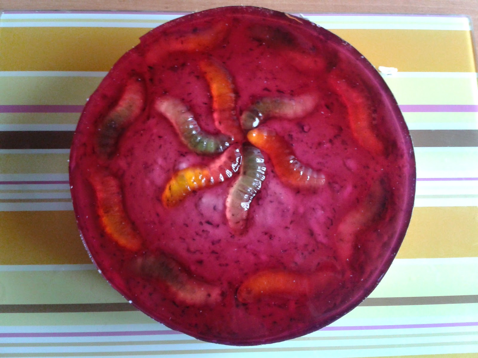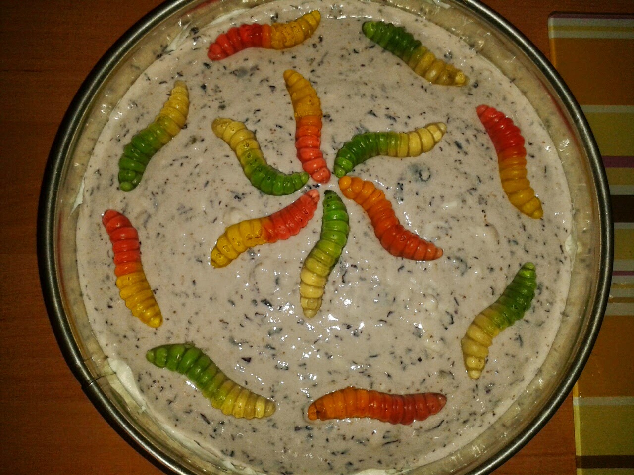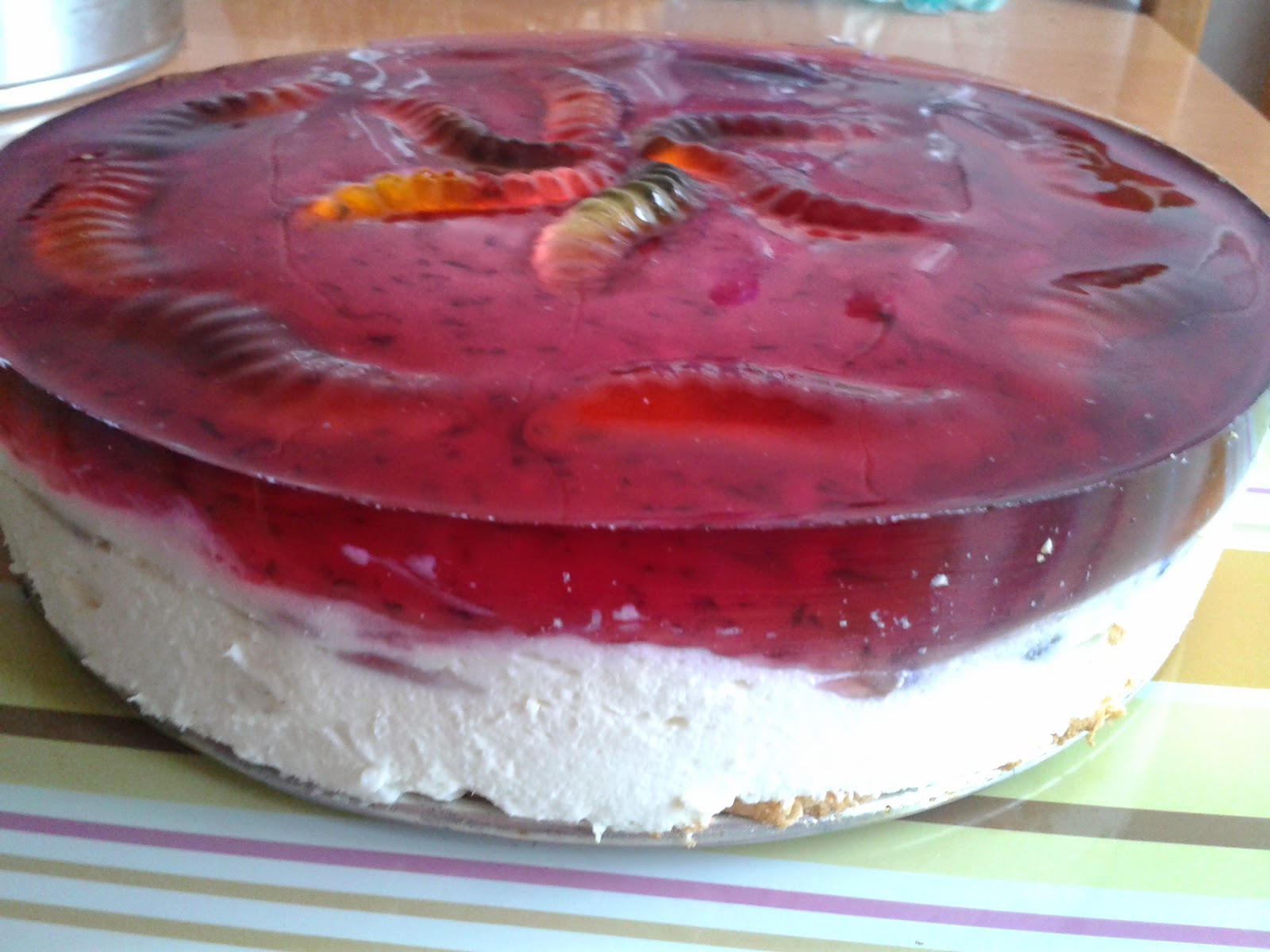 Wyłożyć na tortownicę. Na górę ułożyć żelki i zalać galaretką. Schłodzić przez minimum 2 godziny.
