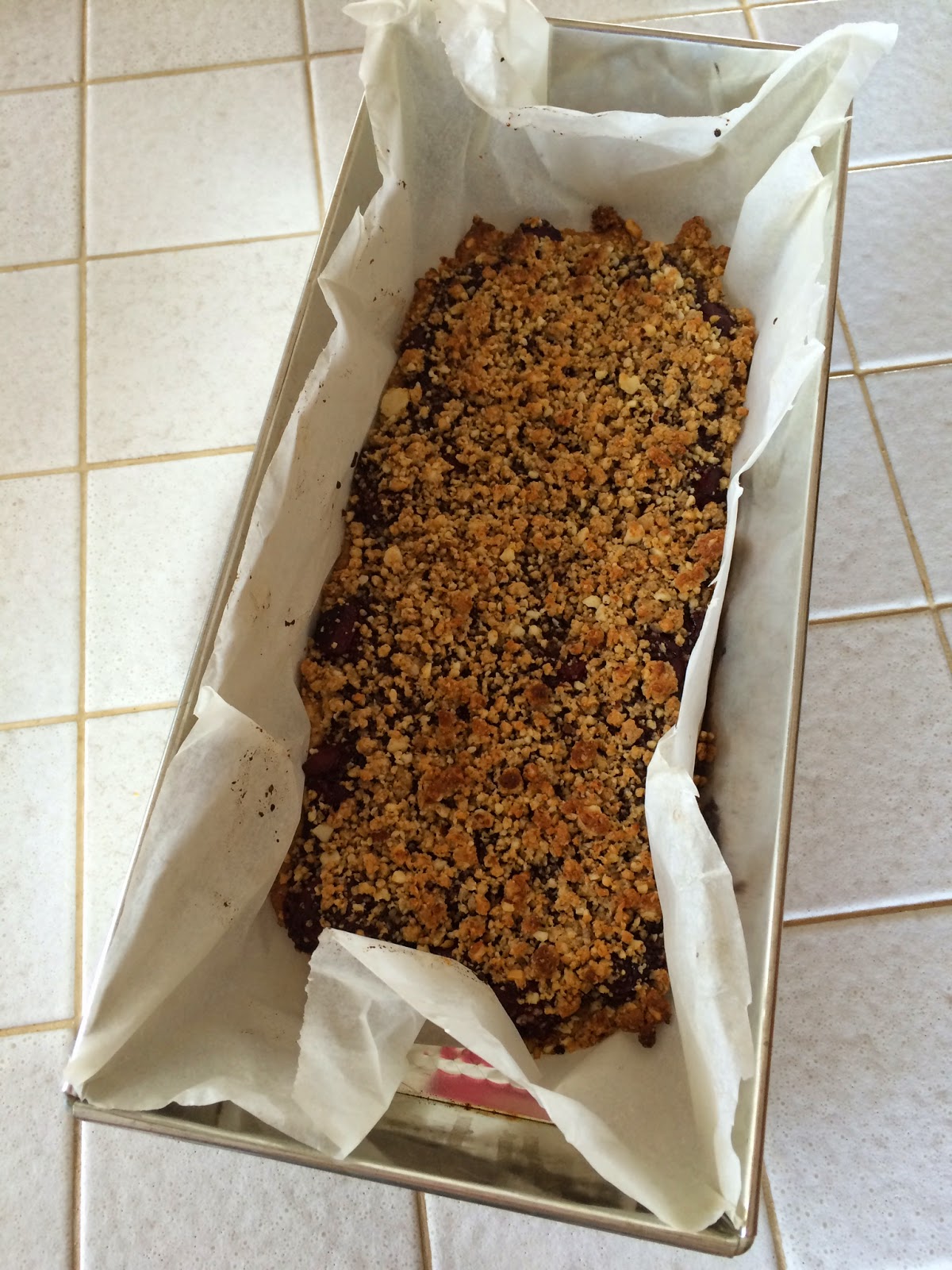 - Wyłóż dżemem upieczony spód ciasta, a następnie posyp pozostałym ciastem.