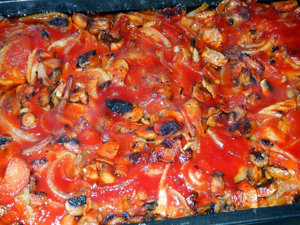 W naczyniu do zapiekania, na dnie, układamy połowę pieczarek. Na to połowę porcji cebuli. Następnie kładziemy obsmażone mięso i znowu cebulę, a na nią resztę pieczarek.