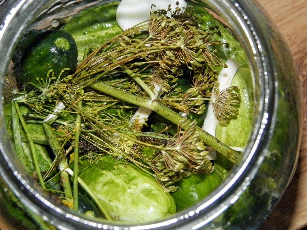 Na dnie słoja bądź innego naczynia, w którym chcemy zrobić ogórki kładziemy gałązkę kopru, czosnek (ok. 2 ząbków; zawsze kroje je na mniejsze kawałki), kawałek chrzanu i liść winogrona. Na tym ścisło układamy ogórki.Dalej, ponownie kładziemy warstwę jw. I znowu ogórki.