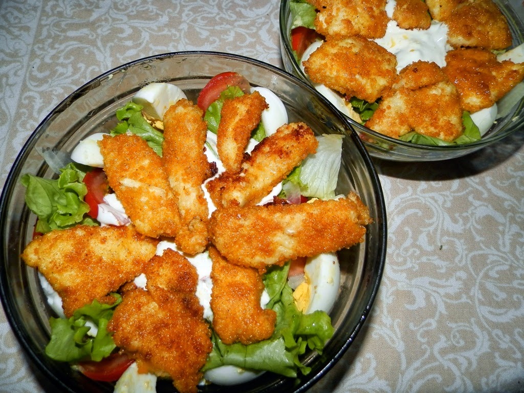 Pierś kroimy na wąskie paski, obtaczamy w jajku, panierce i smażymy na złoty kolor.