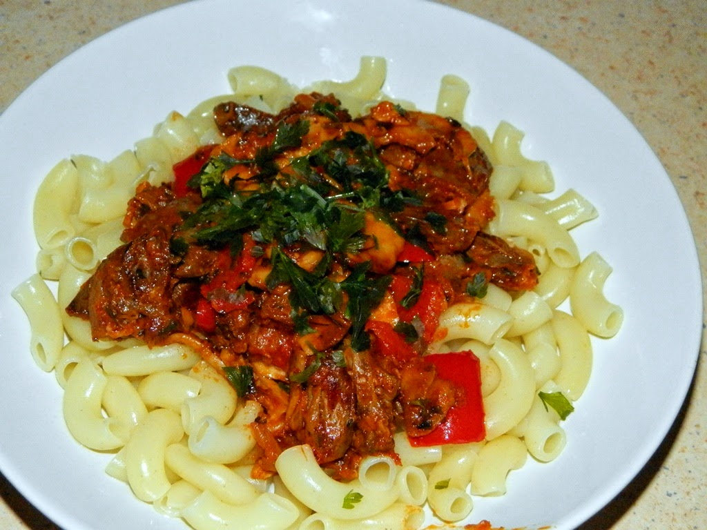Następnie dajemy pieczarki i paprykę, podlewamy ok.1,5 szkl wody i dalej podduszamy. Dokładamy ok. 1 łyżki ostrej pasty paprykowej.