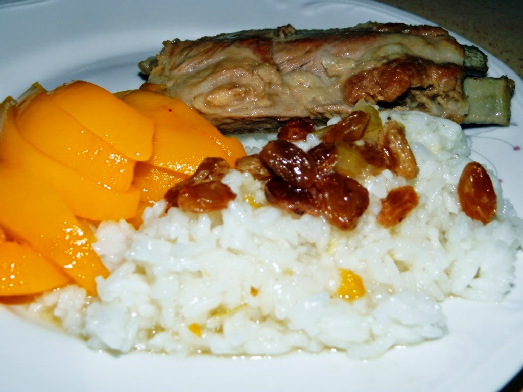 Gotujemy ryż. Mięso układamy na sypkim ryżu, polewamy przygotowanym sosem i dodajemy pokrojone brzoskwinie.
