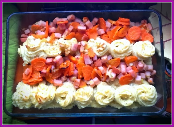 5 Puree z ziemniaków wkładamy do woreczka z szeroką, ozdobną końcówką (gwiazdka) i wyciskamy kilka rzędów (w zależności ile nam się zmieści) pozostawiając miejsce. W to wolne miejsce dajemy mieszankę z warzyw i szynki.