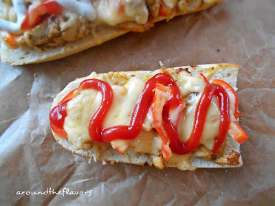 Kurczaka wyłóż na bagietki. Na wierzch wyłóż paprykę i starty ser.