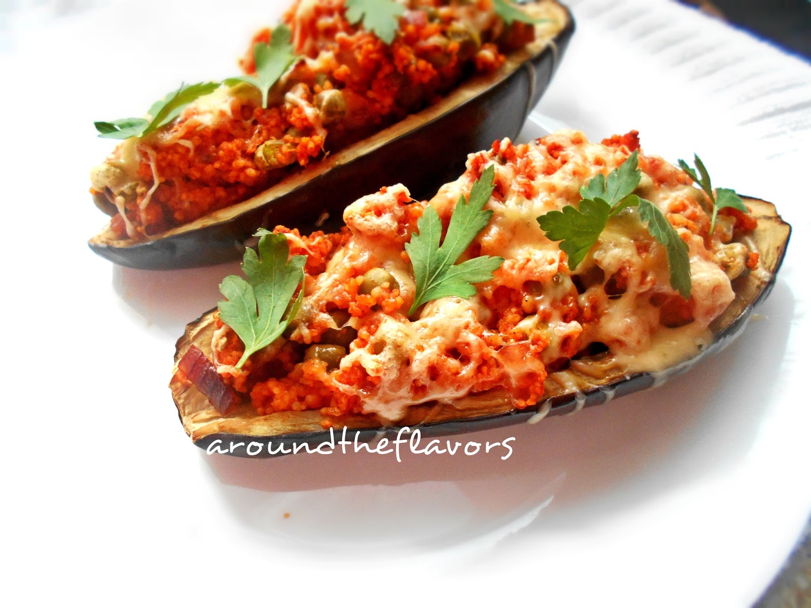 Farsz wyłóż do wydrążonych wcześniej bakłażanów. Skrop oliwą i zapiekaj w 180 C. przez ok. 20 minut, a następnie posyp serem wymieszanym z bułką tartą i zapiekaj przez następne 10 minut.