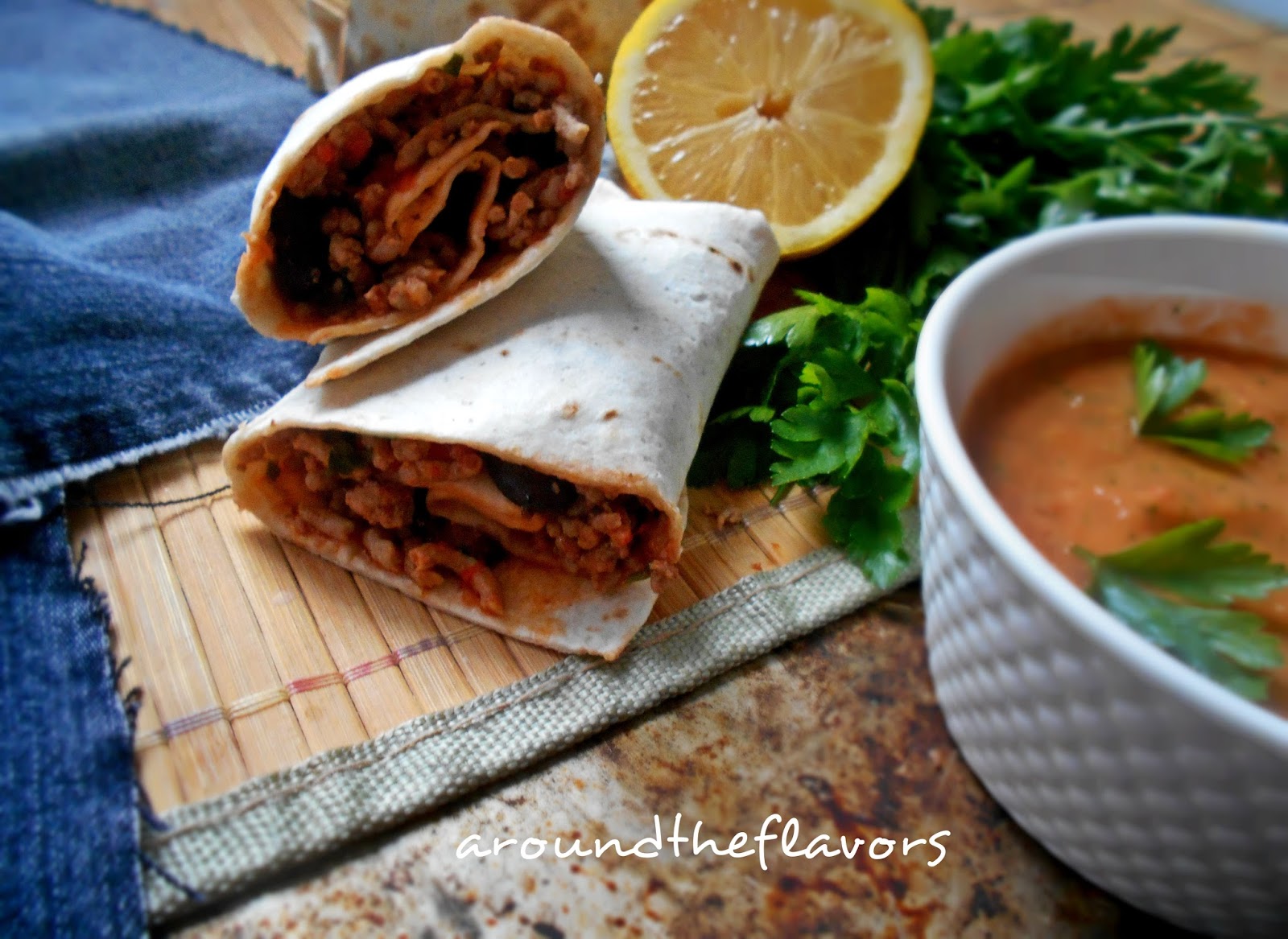 Tortillę podgrzej na suchej patelni lub w piekarniku. Na każdy placek nakładaj farsz i zawijaj. Podawaj z sosem pomidorowym lubi innym ulubionym.