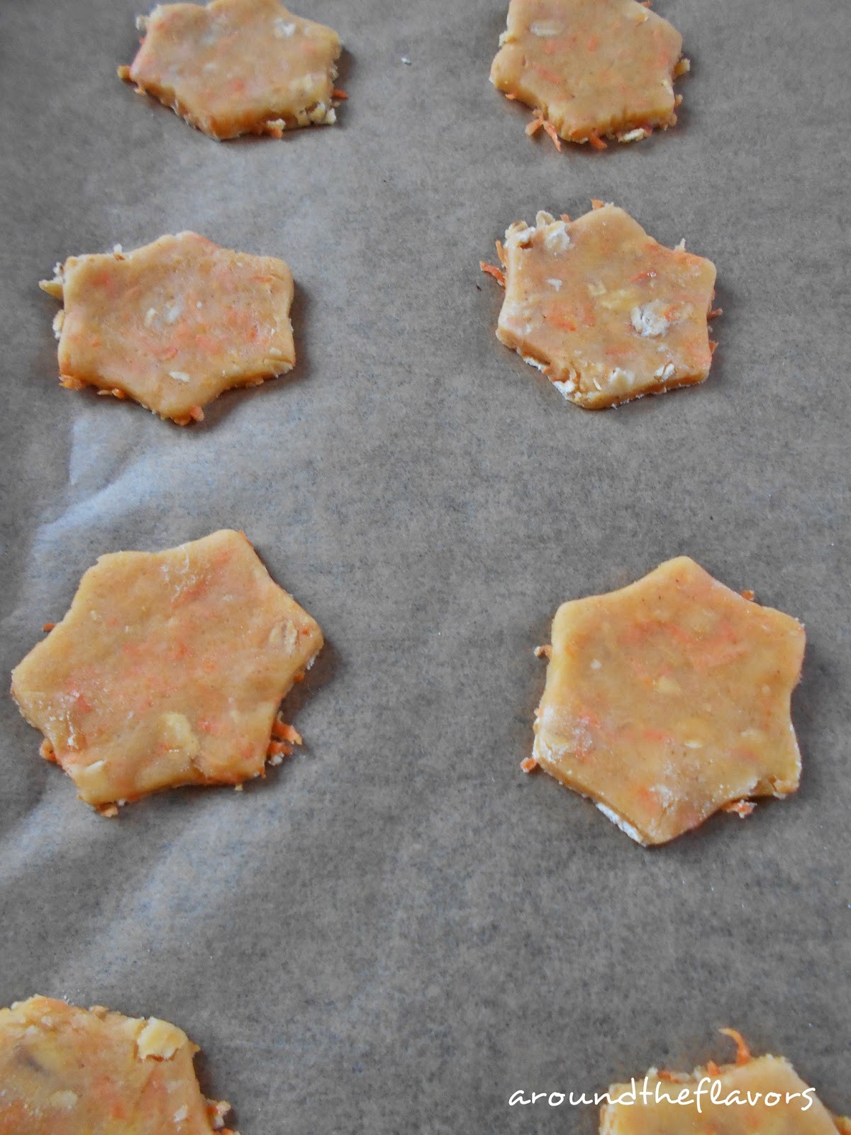 Do miski przesiej mąkę wraz z proszkiem do pieczenia i cynamonem. Dodaj płatki owsiane,cukier,marchewkę i pokrojone masło. Szybko zagnieć ciasto,owiń je w folię spożywczą i wstaw do lodówki na ok. 30 minut.