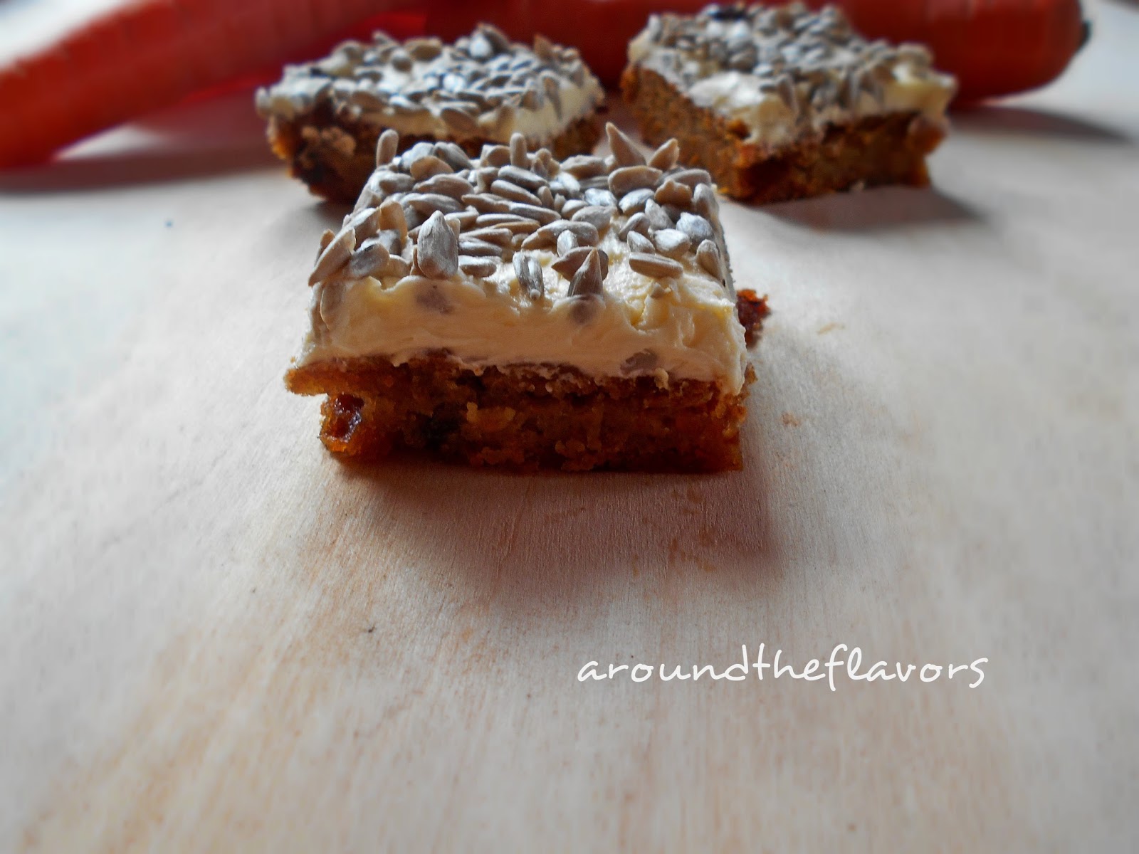 Margarynę utrzyj z cukrem pudrem i ekstraktem waniliowym. Taką masę wyłóż na wierzch ostudzonego ciasta. Posyp ziarnami słonecznika.