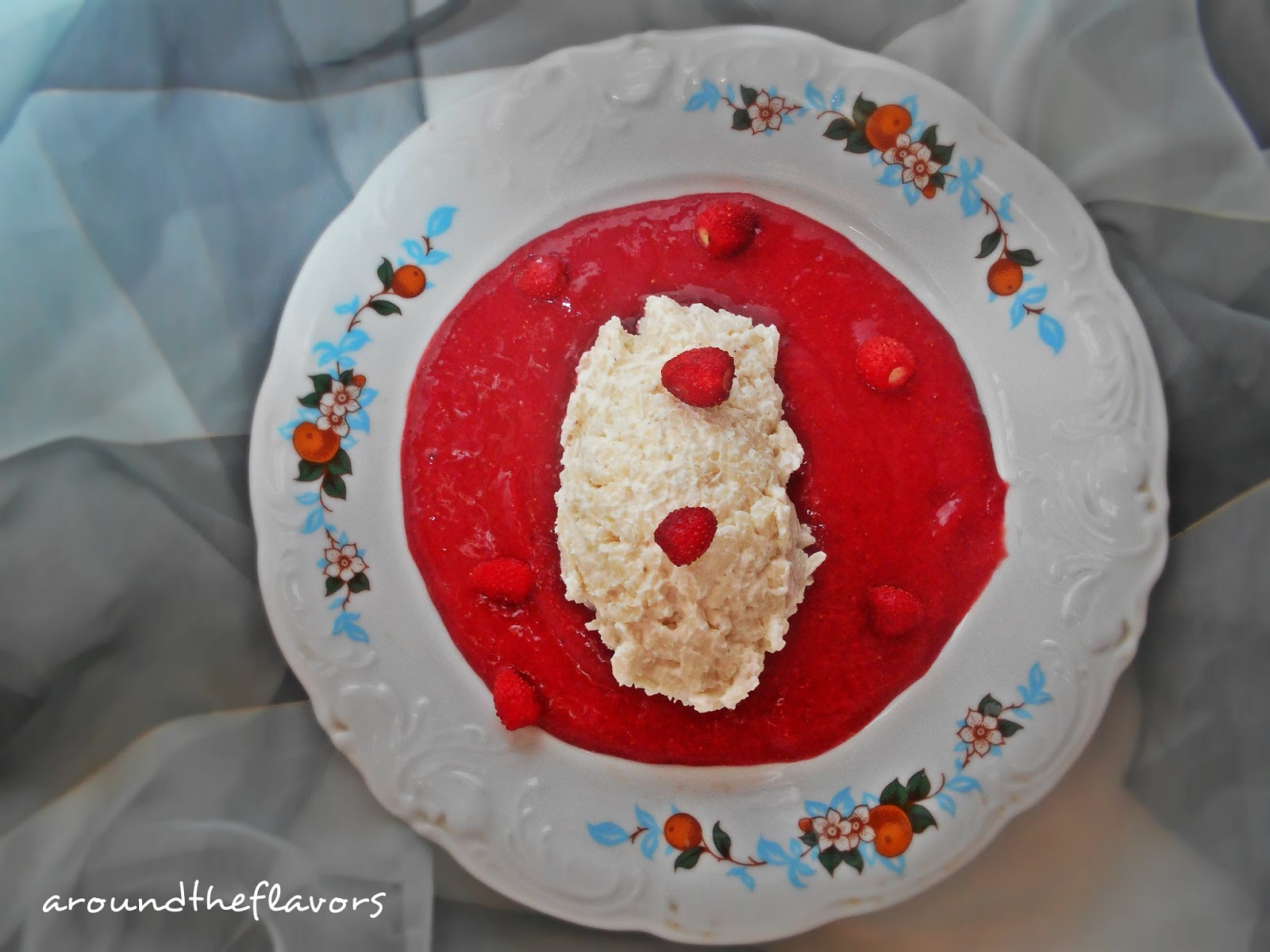 Ryż łyżka nakładaj na przygotowane talerze .Całość posyp pozostałymi poziomkami.