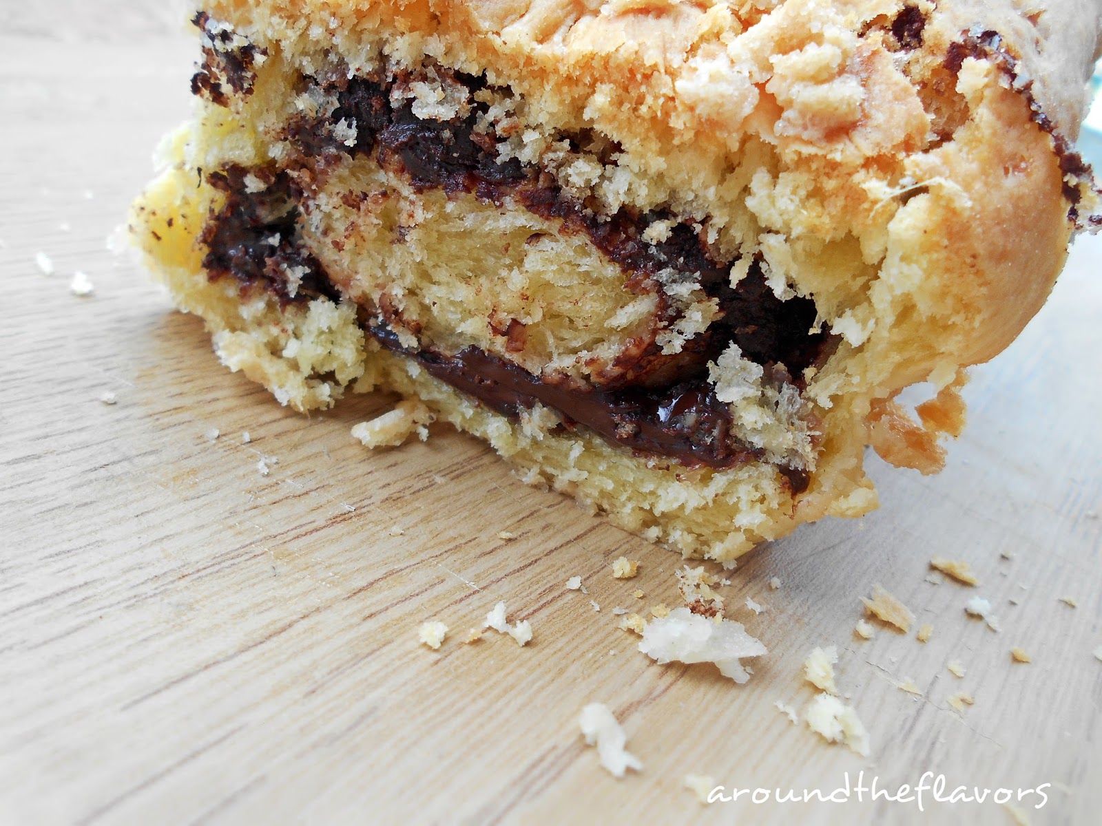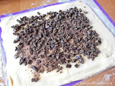 Wyrośnięte ciasto rozwałkuj na prostokąt. Brzegi ciasta posmaruj rozkłóconym białkiem. Czekoladę rozłóż na cieście, zostawiając ok. 2 cm odstępu od brzegu ciasta.