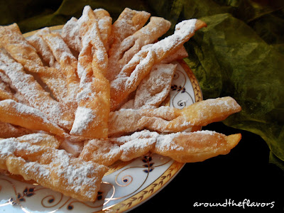 Gotowe faworki posypałam cukrem pudrem wymieszanym z cukrem waniliowym.